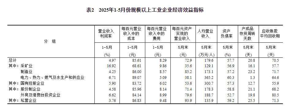 5月末,规模以上工业企业每百元资产实现的营业收入为72.9元,同比减少1.6元;人均营业收入为179.6万元,同比增加5.6万元;产成品存货周转天数为20.8天,同比增加0.1天;应收账款平均回收期为70.5天,同比增加4.1天。