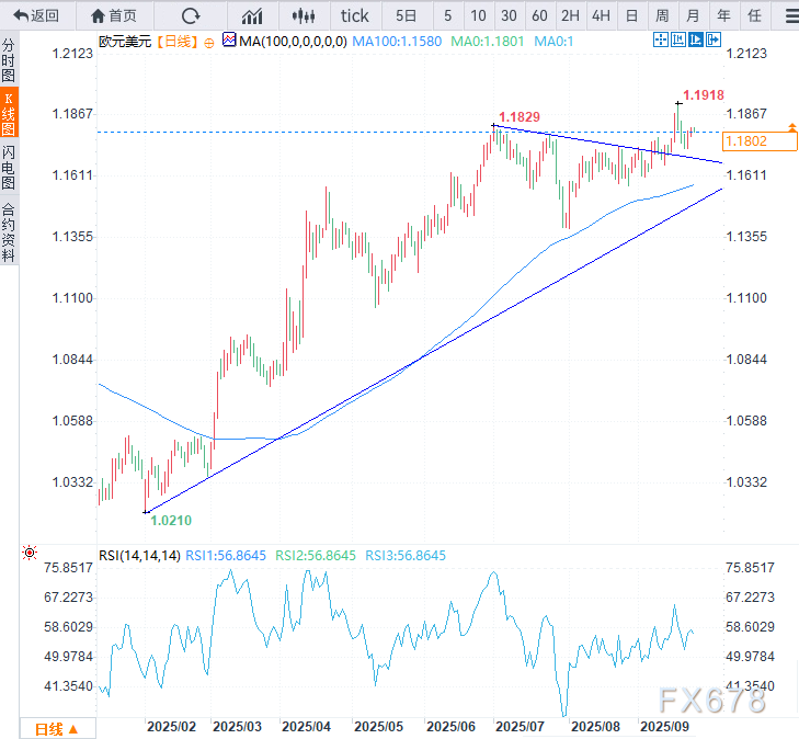 下行方面,若汇价跌破1.1800支撑,下一关键支撑位将看向1.1750,随后是1.1700关口。重要支撑区间位于100日移动均线(1.1580)与8月27日摆动低点1.1574-1.1560形成的共振带。