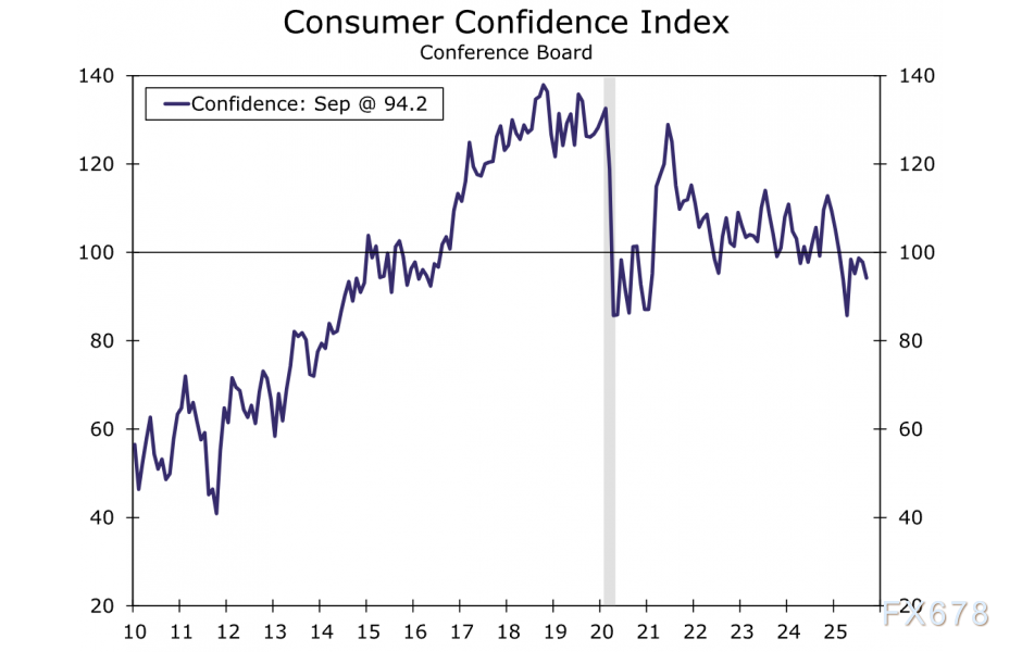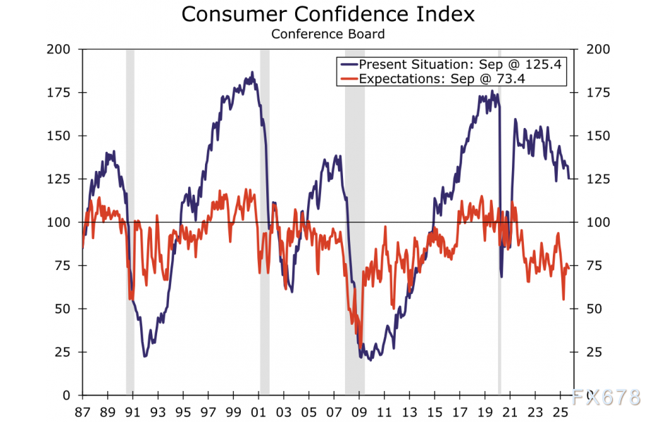 美国九月消费者信心持续下挫。若难以理解为何调研显示的信心滑坡与依然坚挺的消费数据相矛盾,不妨从劳动力市场动能衰退的视角解读民众心理变化。
